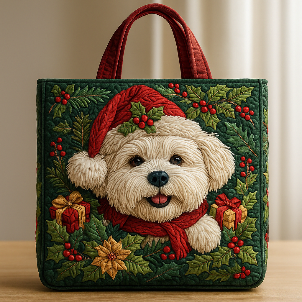 Christmas Puppy Magic Quilted Tote Bag – Holiday 3D Embroidery Edition
